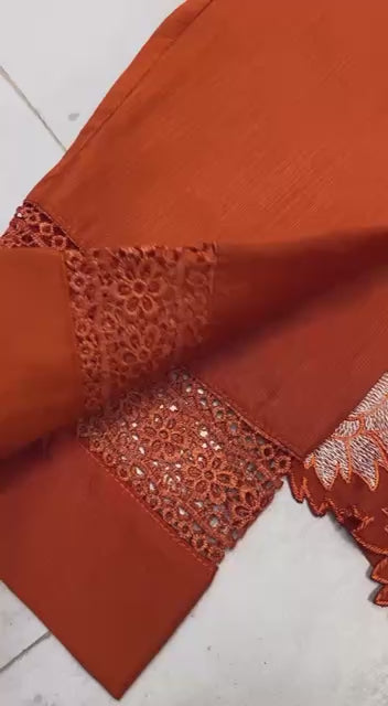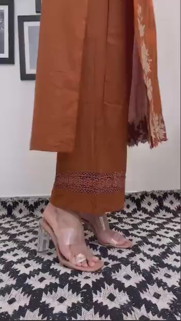 The matching pants are fully stitched and come with GPO lace work on the bottom, giving a coordinated and rich look. Paired with a 2.2 meter dupatta in the same fabric and embroidery style, this set is ideal for daily wear, office, festive occasions or casual outings.