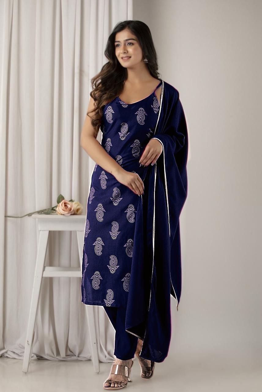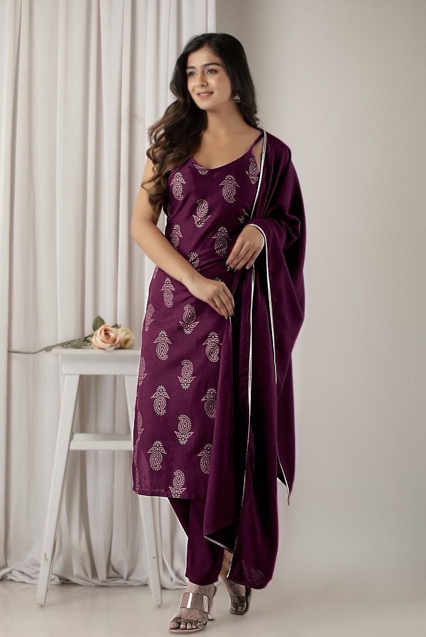 This beautifully crafted suit set is made from 14kg Heavy Reyon and comes with a soft Chinon Dupatta. A perfect blend of comfort and grace, ideal for festive occasions or daily elegance. Available in 4 beautiful colors.